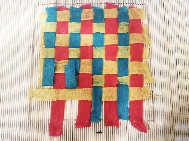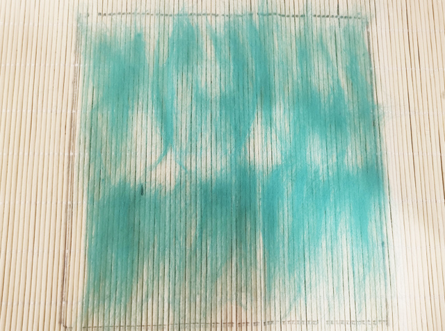 在竹簾上畫(huà)出20*20cm的正方形,將一種顏色的3克羊毛進(jìn)行4等分;