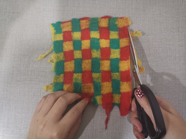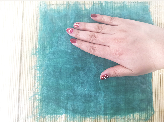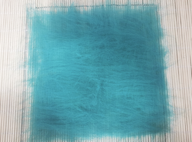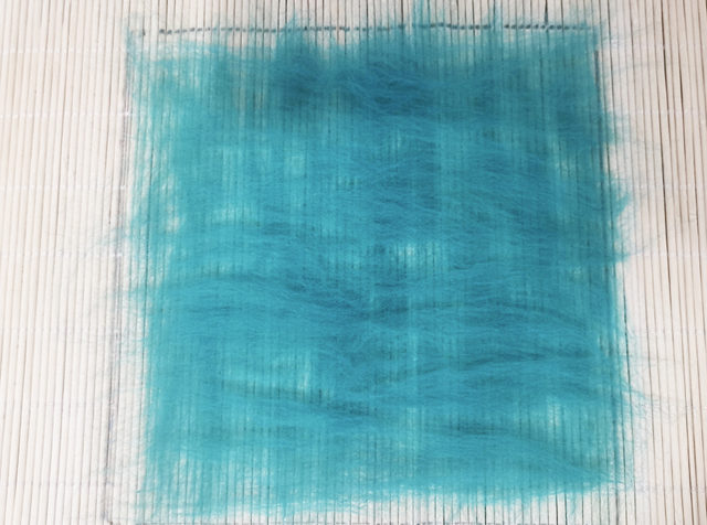 從以上4份羊毛中取1份,一點(diǎn)點(diǎn)撕出薄片,豎向排列整齊,均勻地鋪滿整個(gè)方框;