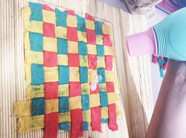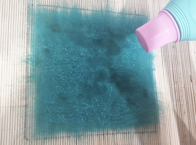 03 均勻地撒上皂液,輕輕的搓洗羊毛,使羊毛迅速氈化成半氈片。紅色、黃色同理。