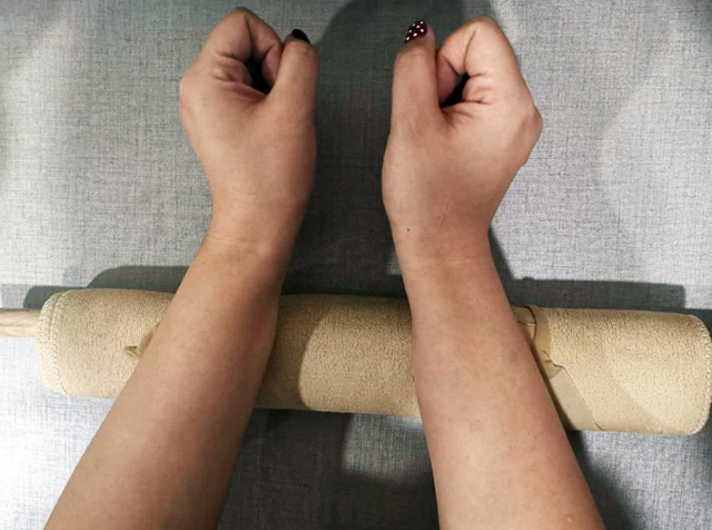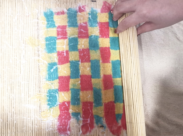 07 將塑料薄膜覆蓋在編織好的氈化片上,并用竹簾、木棍如圖卷曲。
