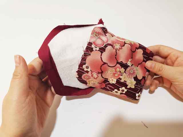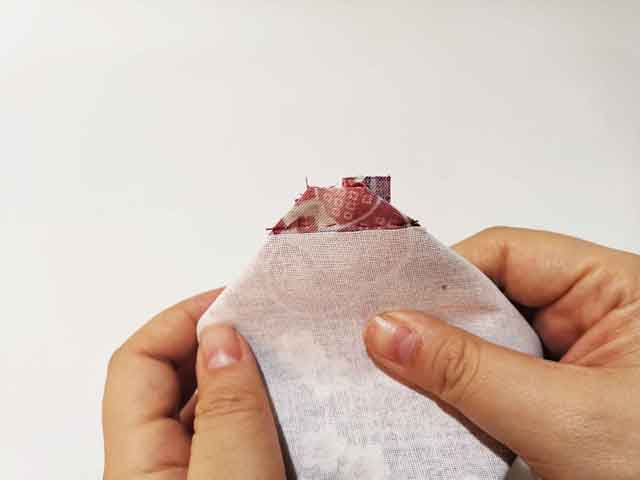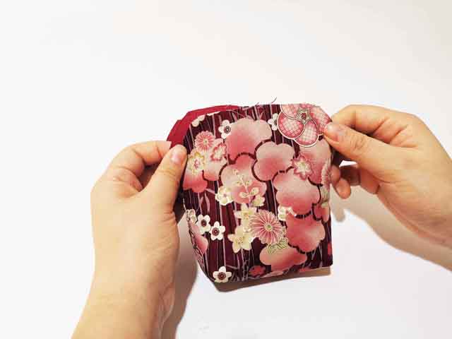 里布放在表布里,包口沿著鋪棉硬襯的縫份對折,用藏針縫技法縫合包口一圈