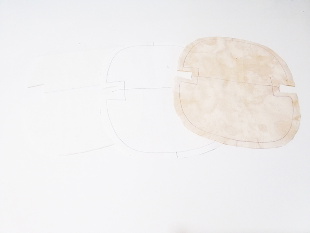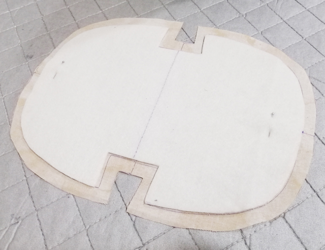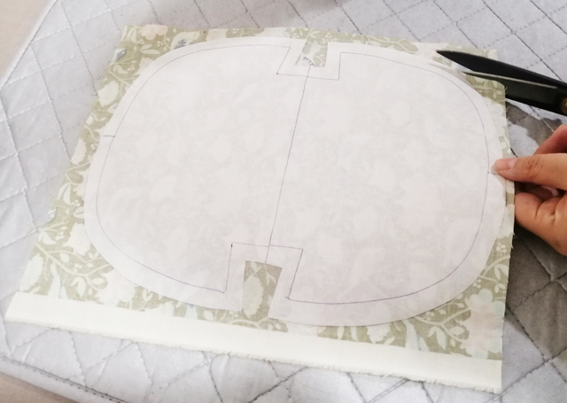 1根據(jù)版型畫在鋪棉,布襯和里布上,鋪棉使用凈尺寸版型,布襯和里布要留出縫份,繪畫完成后剪掉多余的布料