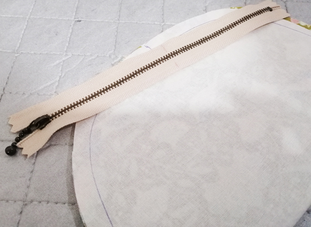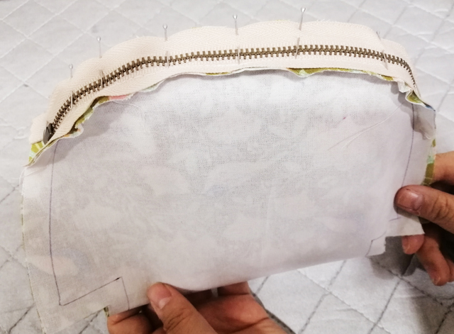 4 找出拉鏈與表布的中點,兩個中點對齊,用珠針固定