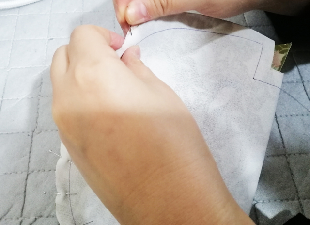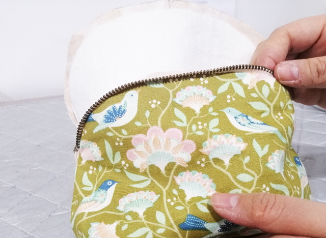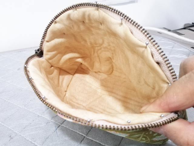 7 里布如圖放在表布里,包口沿著鋪棉的縫份對折并用珠針固定