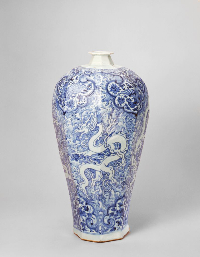 當(dāng)然,除了六棱,還有八棱瓶。比如這件“元景德鎮(zhèn)窯青花海水白龍紋八方梅瓶”。