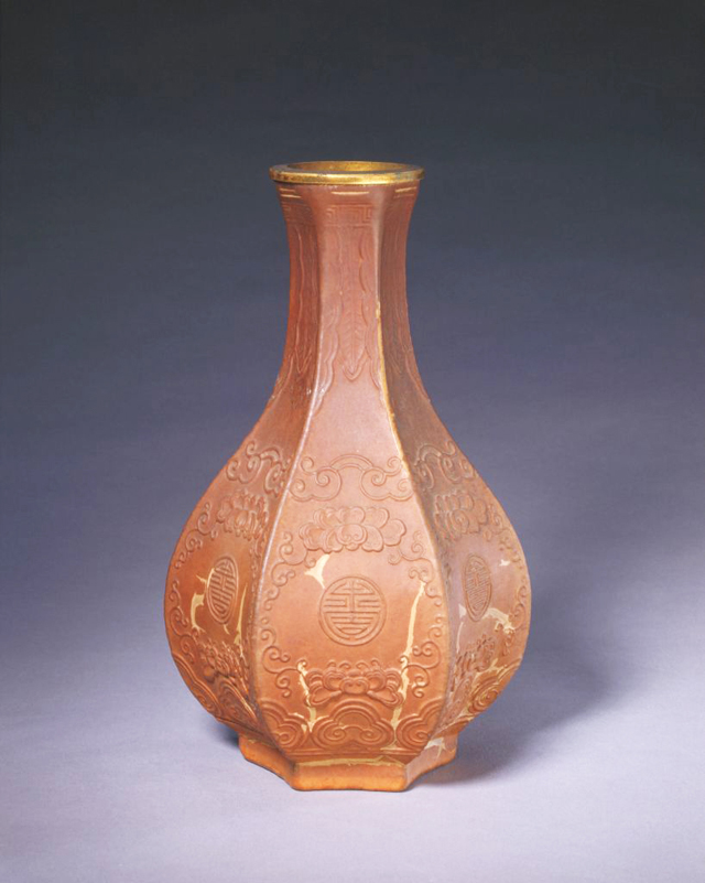 六棱瓶也可以稱(chēng)為六方瓶,是明中晚期流行的瓶式之一,因瓶體作六棱柱形而得名。一般造型為平沿,束頸,豐肩,收腹,底足外闊,瓶身作六方形。