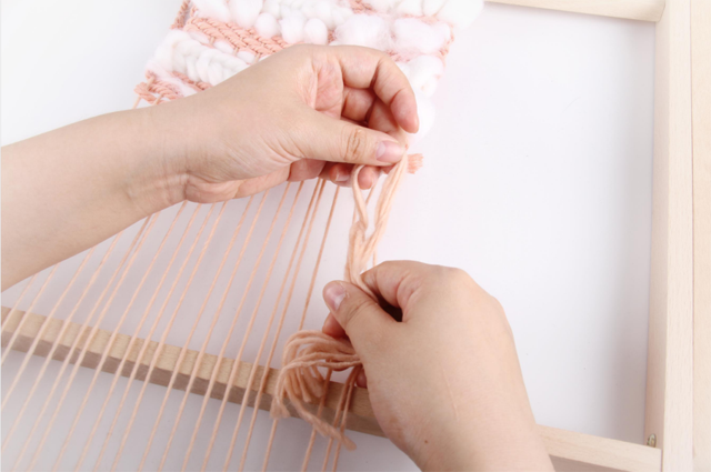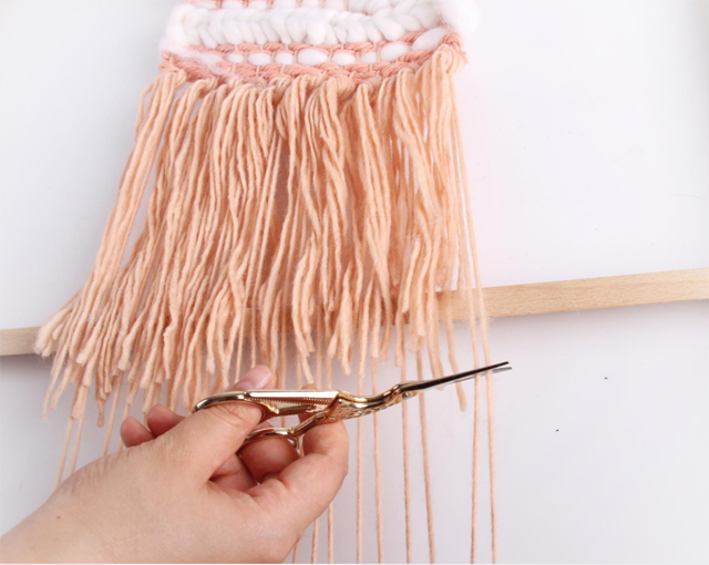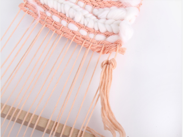 取一根木棍穿過上方的經(jīng)線圈,一個猶如棉花糖一般軟萌的編織小壁掛就完成了。