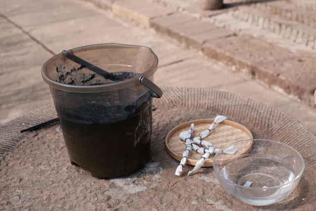 ·配置好一盆靛藍(lán)染料,準(zhǔn)備好需要染色的面料和一盆清水;