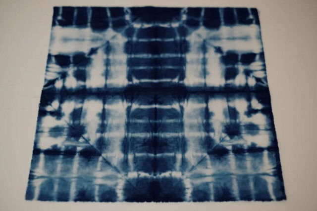 最后,將線圈剪開,鋪平晾曬,擁有豐富網(wǎng)格狀變化的扎染小方巾就制作完成了。