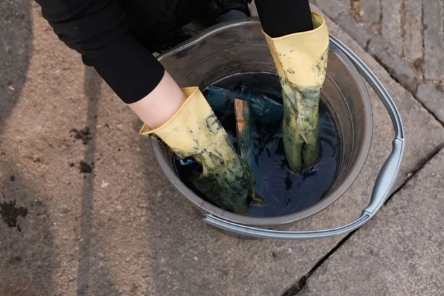 ·配置好一盆靛藍染料,準備好需要染色的面料和一盆清水;