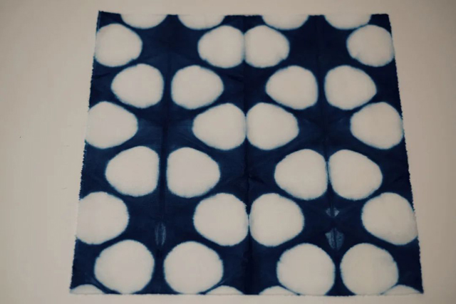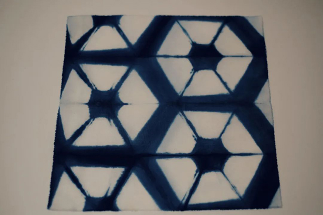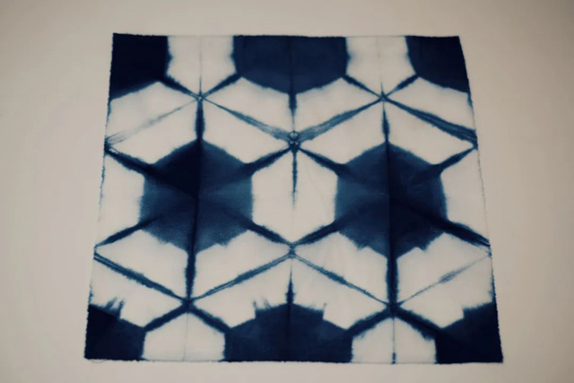 在前兩期的一技扎染課程中,我們對正方形、三角形等折疊技法進行組合運用,創(chuàng)作了多種網(wǎng)格狀對稱紋樣的方巾。