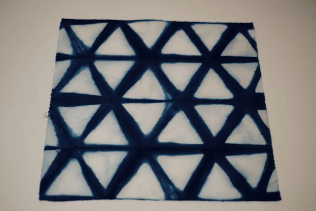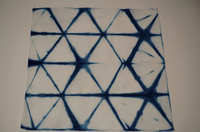 最后,松開皮筋和F夾,鋪平晾曬,擁有三角形幾何紋樣變化的扎染小方巾就制作完成了。