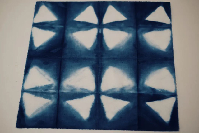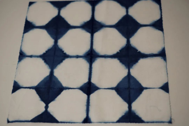 在前幾期的一技扎染課程中,我們對(duì)三角形等折疊技法進(jìn)行組合運(yùn)用,創(chuàng)作了多種網(wǎng)格狀對(duì)稱紋樣的方巾。