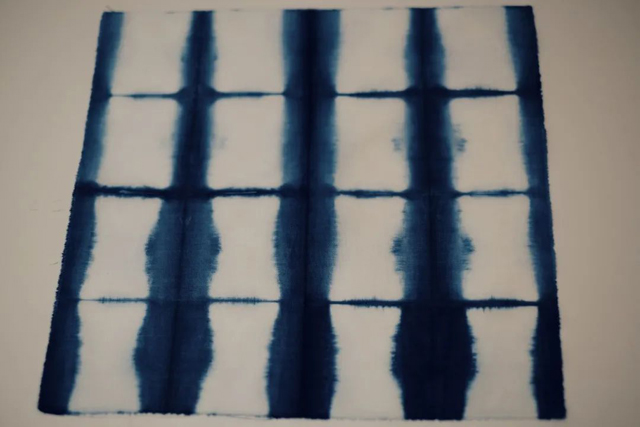 最后,將線圈剪開(kāi),鋪平晾曬,擁有豐富幾何紋樣變化的扎染小方巾就制作完成了。