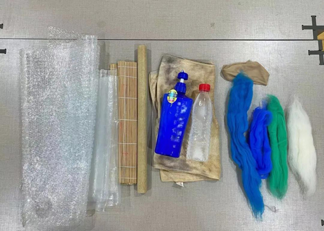5.在塑料薄膜上擺放好圓片,圓片的上方均勻地鋪設(shè)羊毛,并撒上皂液