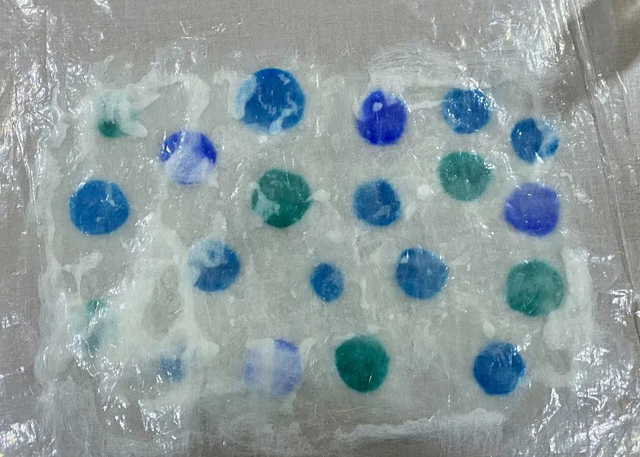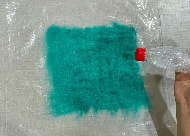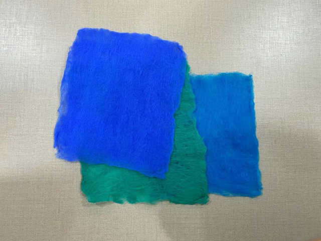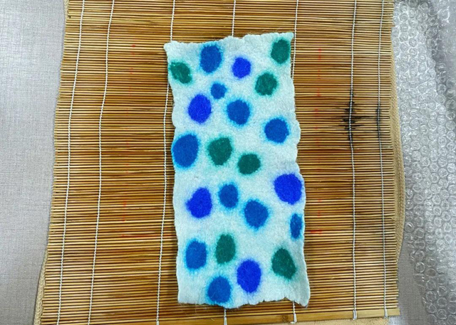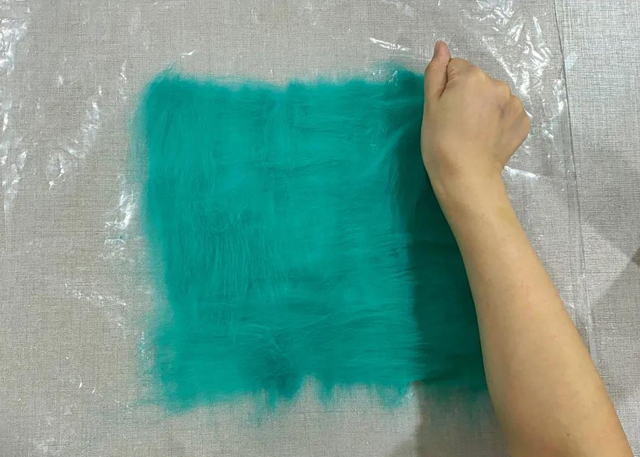 3. 輕輕搟制羊毛,使羊毛迅速氈化成半氈片,其他兩色同理