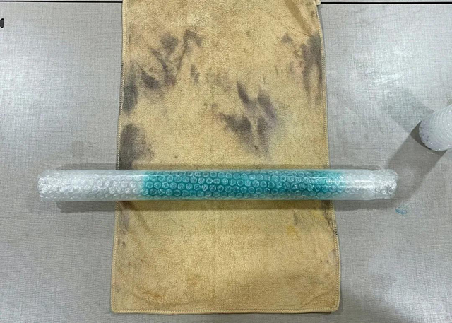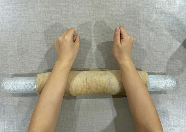 6.將塑料薄膜蓋在編織好的氈化片上,并用木棍如圖卷曲每個(gè)方向搟制2分鐘