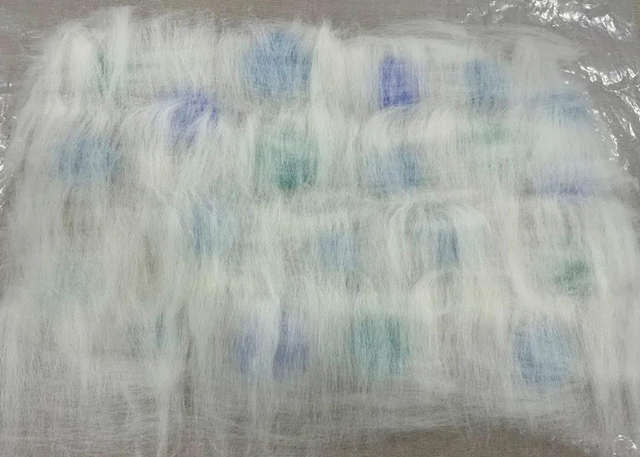 1. 選取三種不同顏色的羊毛各3克,以如下方式均勻鋪設(shè)羊毛: