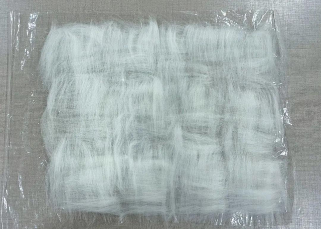 將6等分分好的羊毛取一份撕出薄片,豎向排列整齊;