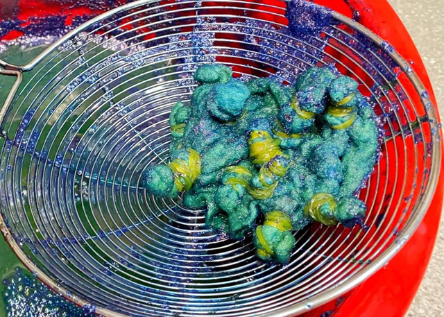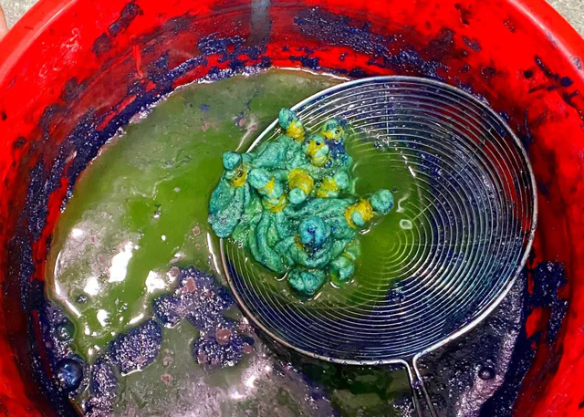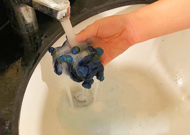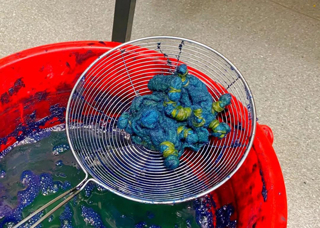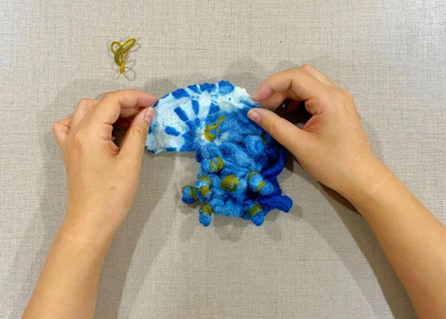 7.將氧化好的面料清洗去除浮色,拆除橡皮筋,一塊扎染羊毛面料就完成啦!
