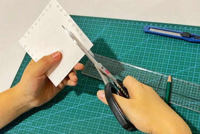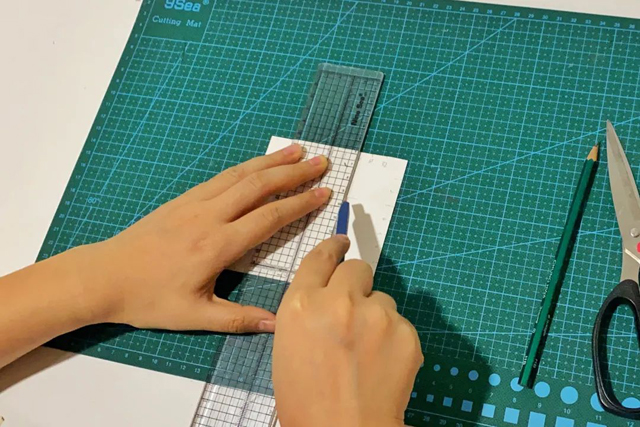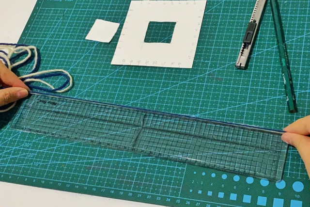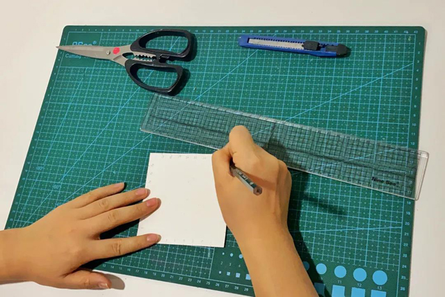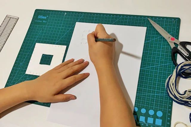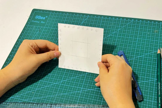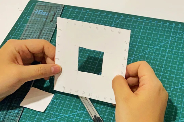 3.在卡紙的中心位置畫出3cm*3cm的正方形并用美工刀挖孔