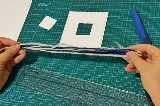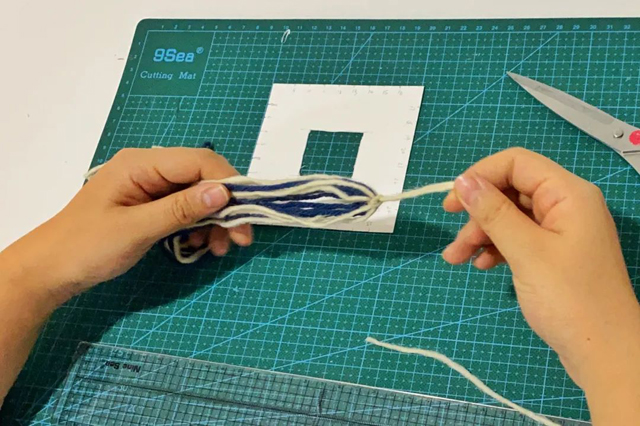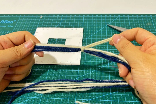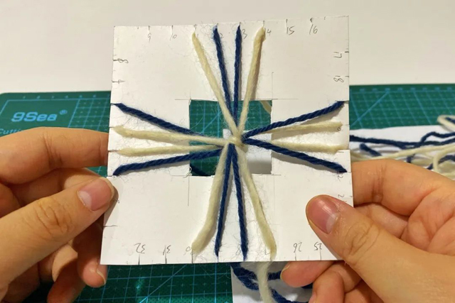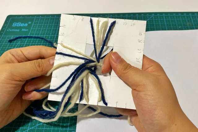 4.取8根白色毛線,8根藍(lán)色毛線,每根30cm長