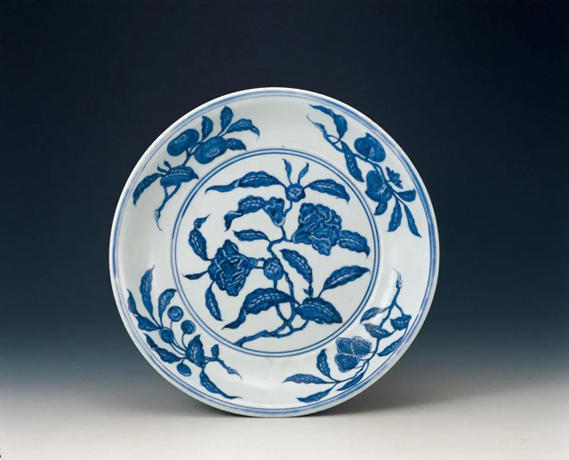 構(gòu)圖上,柿子紋常與其他植物紋飾同時(shí)出現(xiàn),如蘇州博物館館藏文物“青花折枝花果大盤(明 宣德)”,盤內(nèi)壁繪青花折枝仙桃、荔枝、櫻桃、柿子,盤中心紋飾為千葉榴花。題材多為喜聞樂見具有吉祥寓意的花卉果實(shí),畫面寧?kù)o疏展,又暗含對(duì)生活的美好愿景。