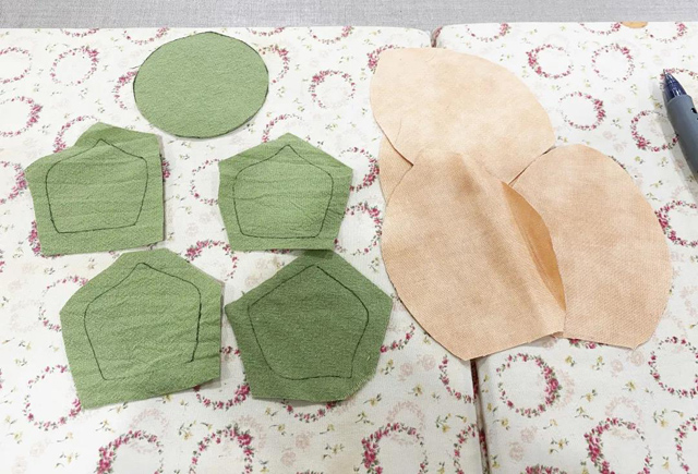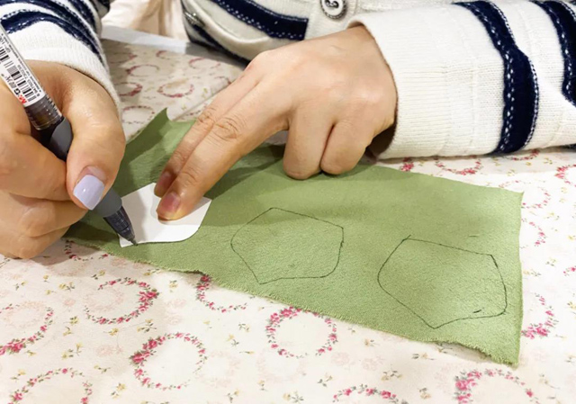 1.在綠色素布上按照版型畫出葉子和根蒂,橘色面料上按照版型畫出果實(shí)部分。