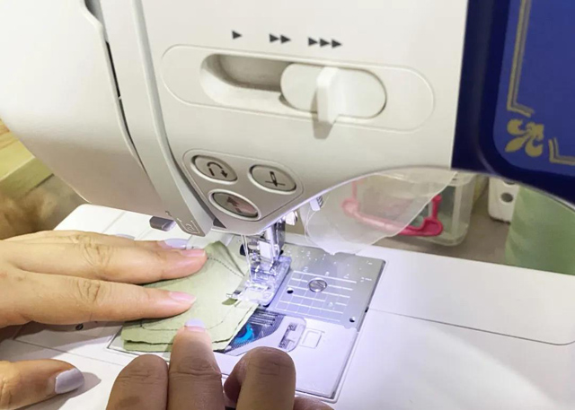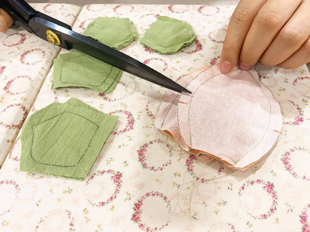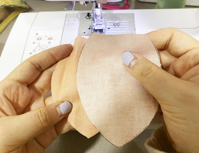 2.果實(shí)部分四片拼接進(jìn)行車縫,葉子部分兩片相對(duì)進(jìn)行車縫。