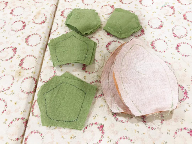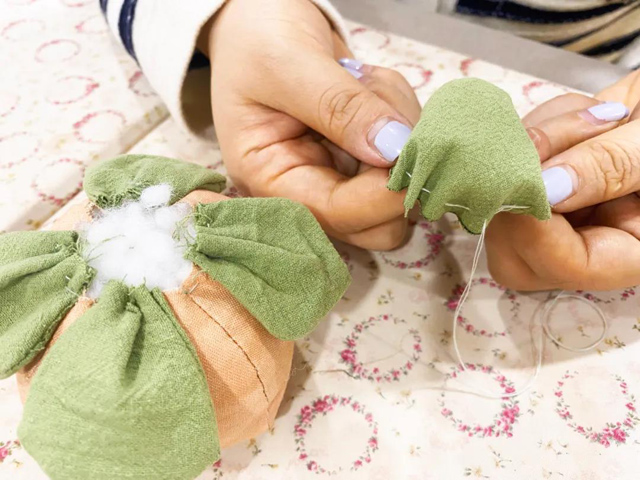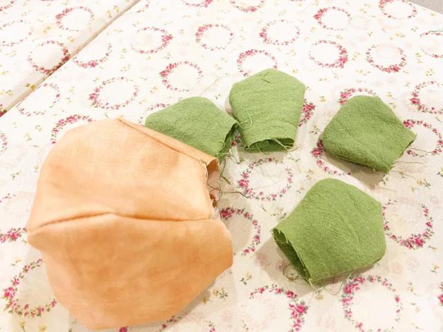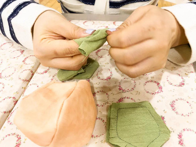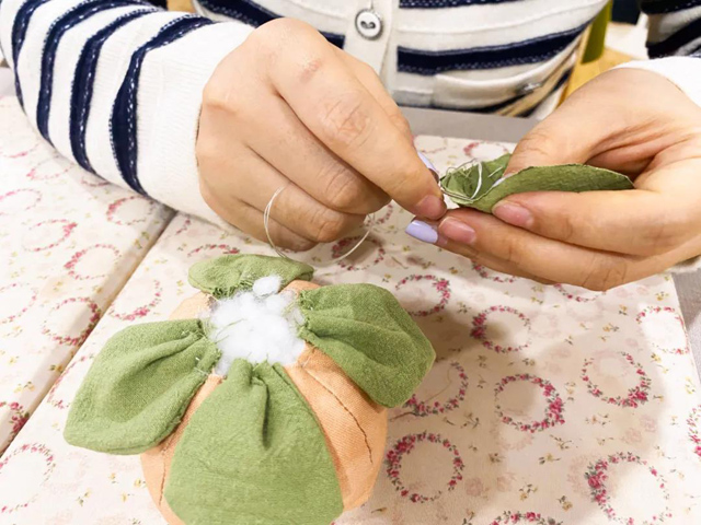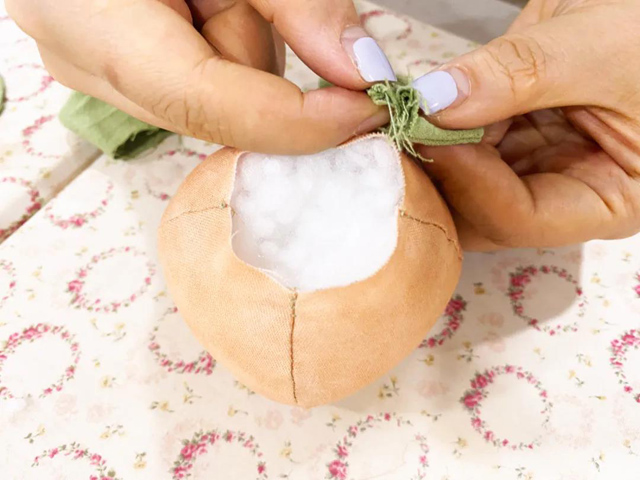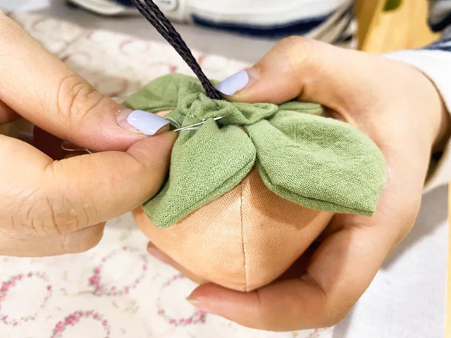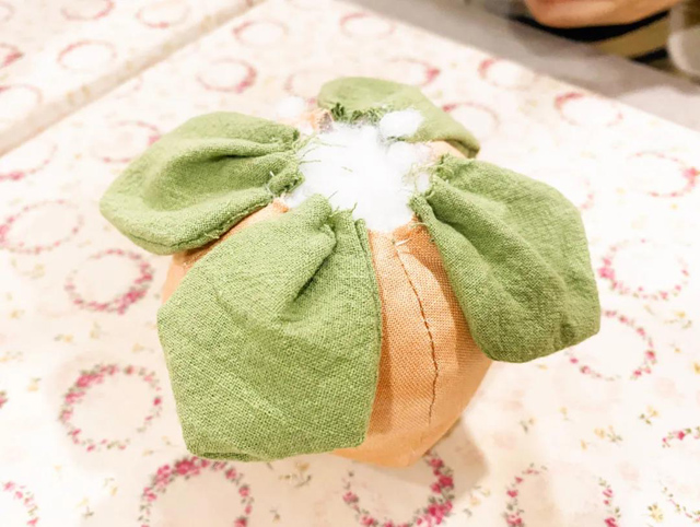 4.在果實(shí)部分裝入填充棉,葉子與果實(shí)部分進(jìn)行縫合。