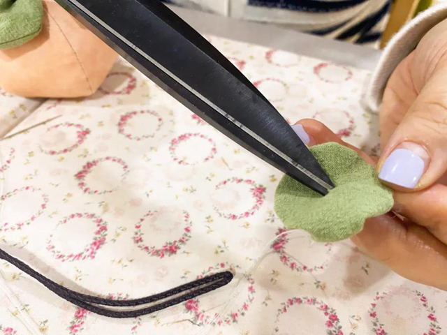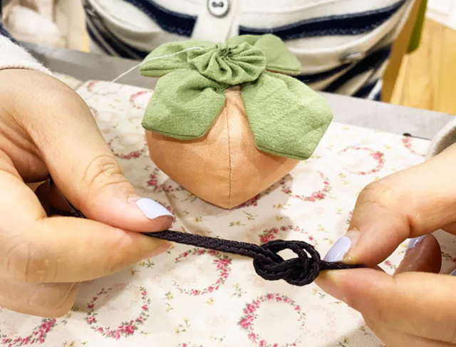 6.取一蠟繩對(duì)折在尾端打結(jié),在根蒂的底部剪出一個(gè)小孔,將蠟繩穿過根蒂,沿著根蒂的一周與葉子進(jìn)行縫合,一個(gè)布藝柿子就完成啦!