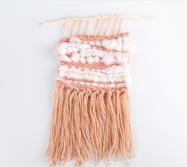 壁掛編織的編織技法多種多樣,其中平紋編織和定位結(jié)編織是常用技法。定位結(jié)編織即將線繩對(duì)折繞在定位線上,然后線頭與定位線交叉向后曲折成的圈中穿過(guò)。