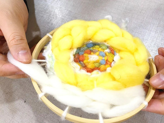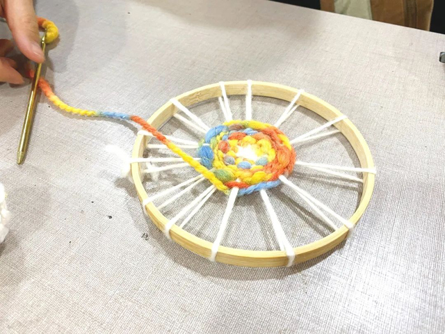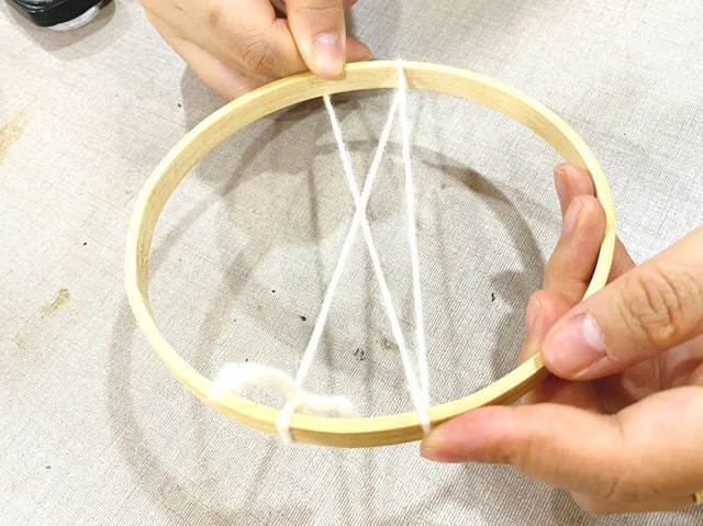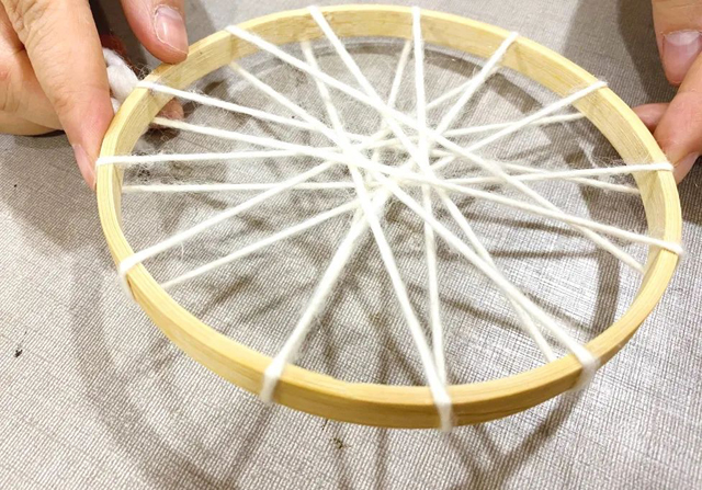 1. 取一段羊毛線作為壁掛的經(jīng)線在繡花繃上如圖進(jìn)行纏繞。