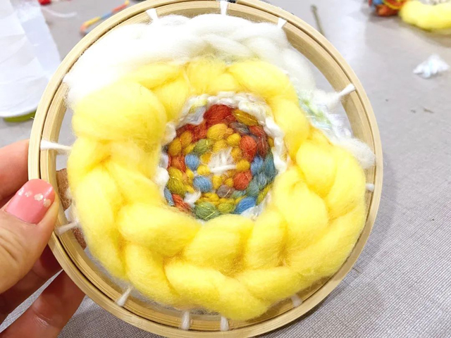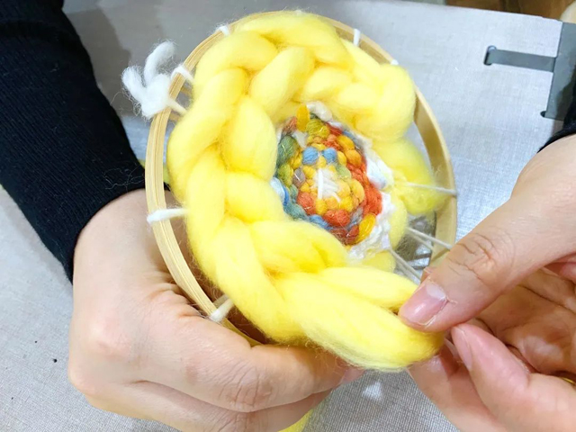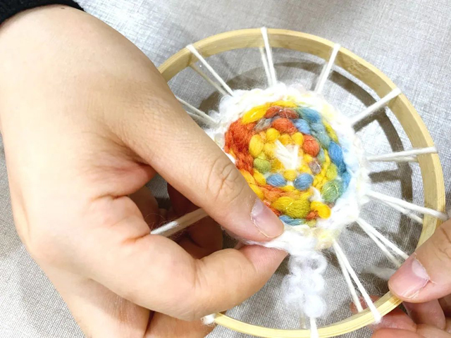 3. 取一段羊毛條對(duì)折用定位結(jié)技法進(jìn)行編織。