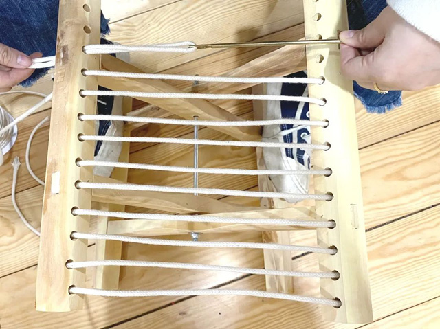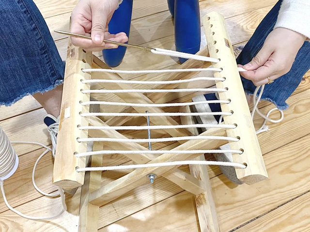 1. 取一段棉繩作為馬扎經(jīng)線,用編織針穿過馬扎側(cè)邊的孔洞進(jìn)行纏繞,并將經(jīng)線拉緊,兩端各留10cm的經(jīng)線,如圖進(jìn)行打結(jié)固定。