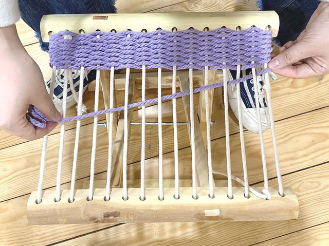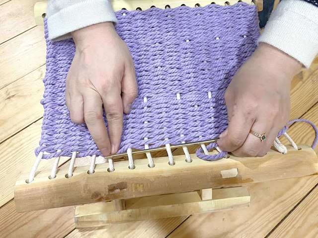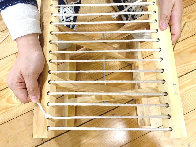 2. 取一段彩色棉線作緯線,并隔一經(jīng)線進(jìn)行上下穿梭。