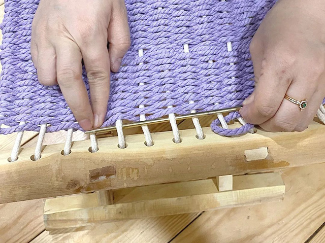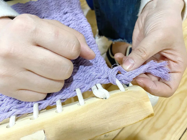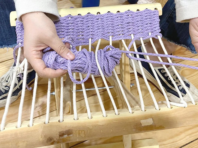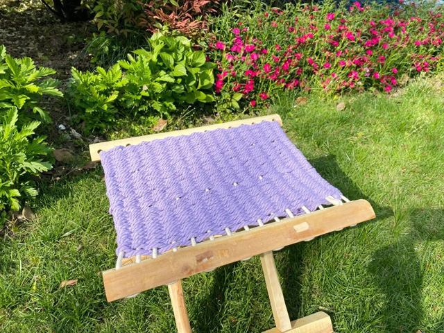 4. 緯線留下的線頭與經(jīng)線打結(jié)固定,一個(gè)編織馬扎就完成了。
