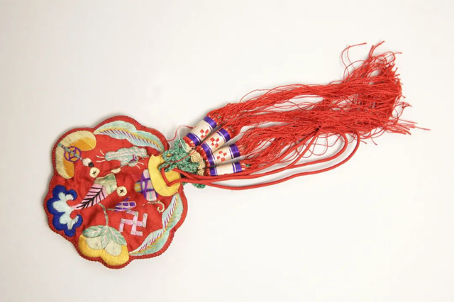 紅緞地彩繡萬(wàn)事如意香囊,中國(guó)絲綢博物館藏