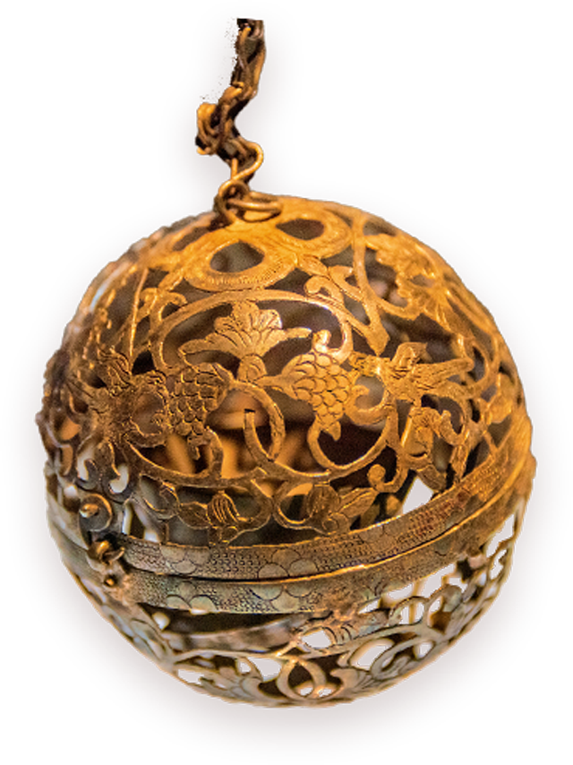 除了絲帛刺繡制成的香囊之外,在材質(zhì)上還有金、銀等金屬材質(zhì)制成的香囊。陜西歷史博物館收藏的唐代鏤空纏枝紋銀香囊呈球形,由上下兩部分扣合而成。由于其巧妙的內(nèi)部結(jié)構(gòu),香料并不會(huì)隨著香囊的轉(zhuǎn)動(dòng)而傾灑,其原理大致相當(dāng)于現(xiàn)在的陀螺儀。