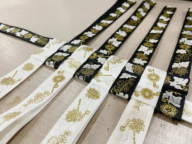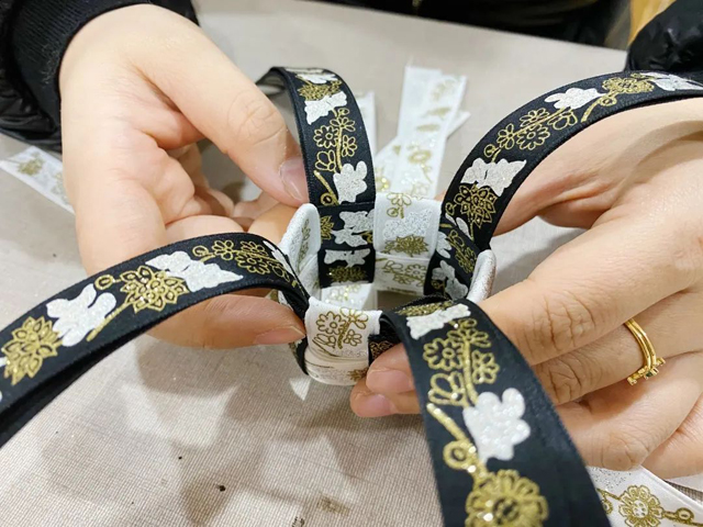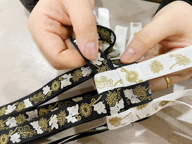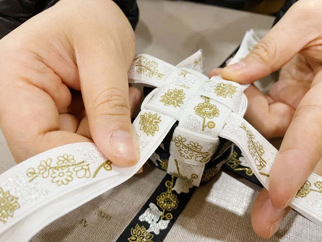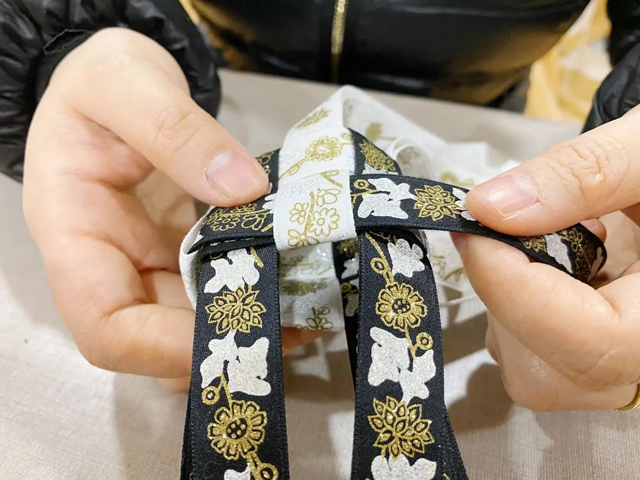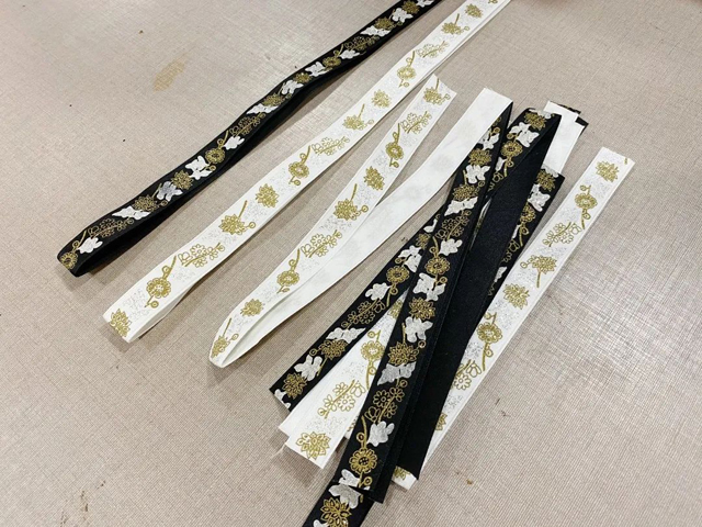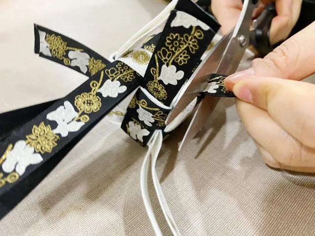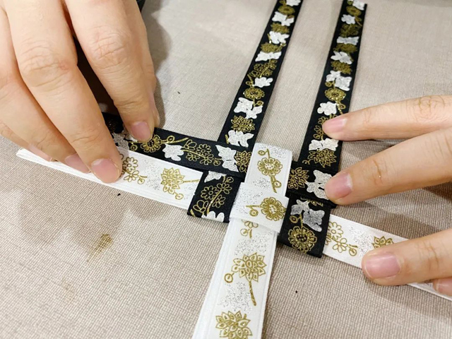 1. 將織帶裁剪出長(zhǎng)度40cm的2條,30cm的8條。