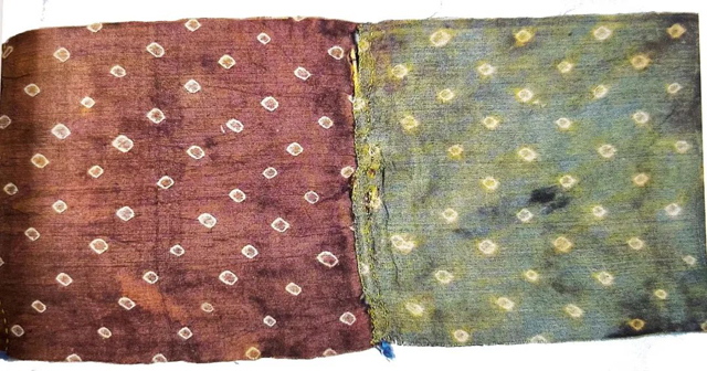 據(jù)史料記載,早在東晉時(shí)期(公元4世紀(jì)),扎染已經(jīng)應(yīng)用于先民的穿著及日用織品。1965年在甘肅省敦煌莫高窟第130窟主室南壁巖孔內(nèi)發(fā)現(xiàn)了唐多色花鳥紋纈染幡。此幡為彩色絹幡,幡身六段,除第三段為蠟纈絹,其余各段為花紋纈絹,在綠地或紫地上顯出成行整齊的白點(diǎn)。幡身各段相接處撐以芨草棍,兩側(cè)綴藍(lán)色短絲穗。這件絹幡縫制工細(xì),色彩鮮麗,紋樣精美,保存完整。