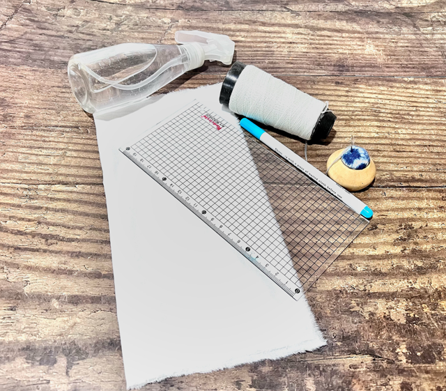 3塊正方形白色面料(棉布、絲綢等)、棉線、手縫針噴壺、水消筆、尺子、剪刀、配置好的靛藍(lán)染料一盆(可搜索關(guān)鍵詞“DIY靛藍(lán)染料材料包”按需購買)