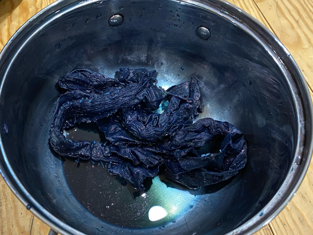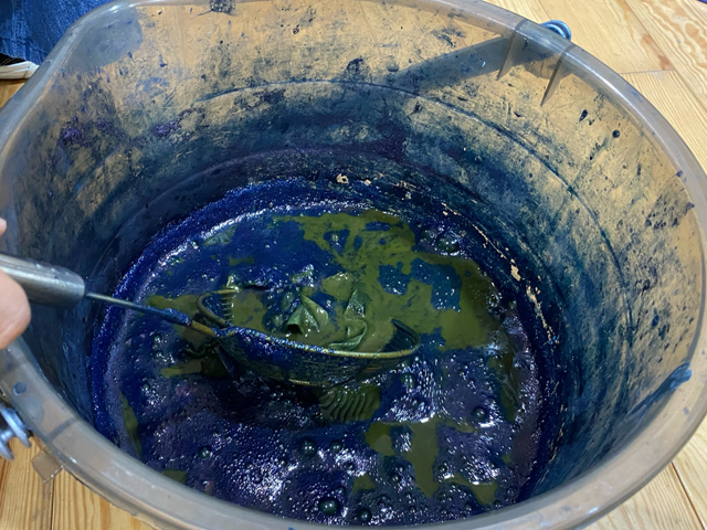 1. 配置好一盆靛藍(lán)染料,準(zhǔn)備好需要染色的面料和一盆清水;將捆扎好的面料浸水后,投入染料中進(jìn)行染色;