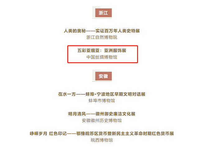 為深入學(xué)習(xí)貫徹黨的二十大精神,廣泛培育和踐行社會(huì)主義核心價(jià)值觀,國(guó)家文物局首次聯(lián)合中央精神文明建設(shè)辦公室、中央網(wǎng)信辦啟動(dòng)2023年度“弘揚(yáng)中華優(yōu)秀傳統(tǒng)文化、培育社會(huì)主義核心價(jià)值觀”主題展覽征集推介活動(dòng),并于5月18日公布名單。納入此次推介項(xiàng)目名單的主題展覽共計(jì)100項(xiàng),其中重點(diǎn)推介項(xiàng)目20項(xiàng)。其中,浙江入選2個(gè)展覽,中國(guó)絲綢博物館的“五彩亞細(xì)亞:亞洲服飾展”為其一。
