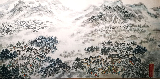 作品介紹:2007年,在籌備浙江理工大學辦學110周年校慶,由葛建綱策劃,陳冰心教授歷時六個月,跨越春夏,冒著酷暑,克服種種困難,前后三次重走抗戰(zhàn)流亡辦學西遷之路寫生而成。畫作共有15篇章,描繪了在日寇橫行,戰(zhàn)火紛飛的年代里,蠶校艱難辦學的歲月。此畫原件現(xiàn)收藏展示于浙江理工大學絲綢博物館。