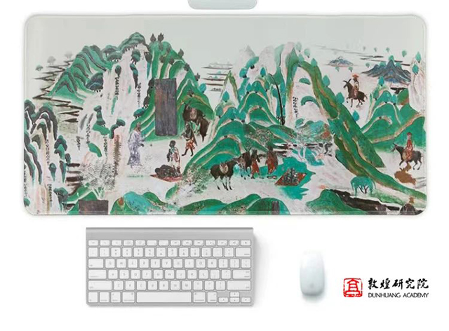 產(chǎn)品上的青綠山水圖出自莫高窟盛唐第217窟的佛頂尊勝陀羅尼經(jīng)變畫,表現(xiàn)經(jīng)文中講述的巡禮五臺山遇文殊老人的故事。畫面自上而下的描繪出自西土而來、路遇文殊化現(xiàn)的老人,受指點返西土取經(jīng)、取經(jīng)歸來、入宮獻經(jīng)的內(nèi)容。本品圖案選取描繪五臺山景色的片段,石青、石綠的交錯疊染使畫面層次分明、青綠相映成趣,置身其中,使人倍感恬淡清幽、意趣深遠。