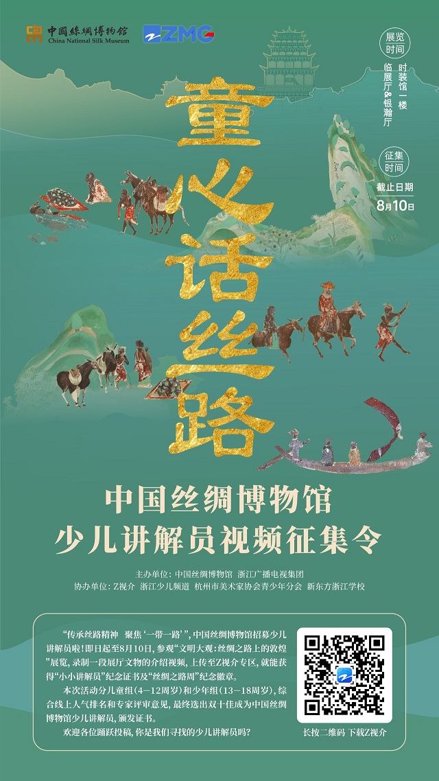 7月24日-8月15日,國絲推出“童心話絲路”少兒講解員視頻征集活動,觀眾參觀“文明大觀:絲綢之路上的敦煌”展覽,錄制一段展廳文物介紹視頻,上傳至Z視介專區(qū),就能獲得“小小講解員”紀念證書及“絲綢之路周”紀念徽章。8月19日起,參賽人員可在Z視介活動專區(qū)領取電子證書,并憑借視頻截圖至博物館前臺領取徽章一枚。
