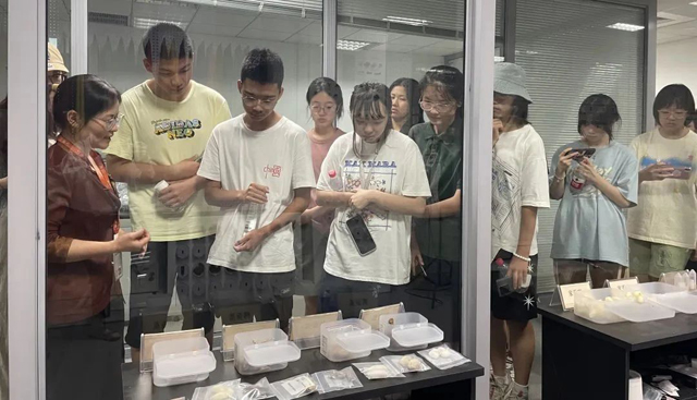當(dāng)天上午,在簡(jiǎn)短的開營(yíng)儀式后,由講解員帶領(lǐng)同學(xué)們,參觀“絲路綺粲:16-17世紀(jì)匈牙利艾斯特哈茲家族絲綢服飾展”、“文明大觀:絲綢之路上的敦煌”展覽。在技術(shù)部科研人員帶領(lǐng)下走進(jìn)實(shí)驗(yàn)室,參觀了紡織品現(xiàn)代標(biāo)本庫(kù)和在紡織品文物材質(zhì)鑒定和染料鑒定方面應(yīng)用的儀器設(shè)備,包括掃描電鏡、紅外光譜、高效液相色譜質(zhì)譜聯(lián)用儀和顯微鏡等。