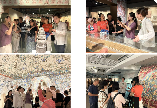 講解員為聽障觀眾們講解了暑期兩大特展“文明大觀:絲綢之路上的敦煌”和“絲路綺粲:16-17世紀(jì)匈牙利艾斯特哈茲家族絲綢服飾展”。他們對展覽表達(dá)的敦煌文化表示出了很高的熱情,從出土的隨葬品到莫高窟供養(yǎng)人,從艾斯特哈茲家族珍藏的掛毯到馬鞍,盡管言語溝通不暢,他們也通過手語老師頻頻提問。例如,通過敦煌展,他們了解到原來在絲綢之路上的主要交通工具并非只有沙漠之舟——駱駝,主要為驢、牛、馬等。在285復(fù)刻洞窟,他們更是表達(dá)了驚喜和熱情,專注地聽完了講解員講述的洞窟文化故事。