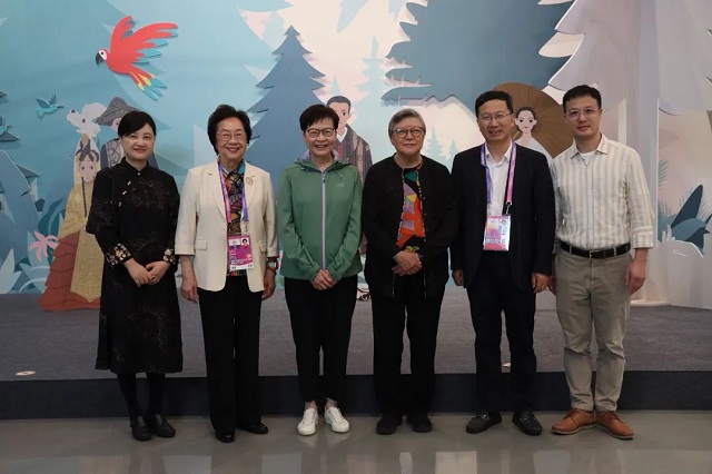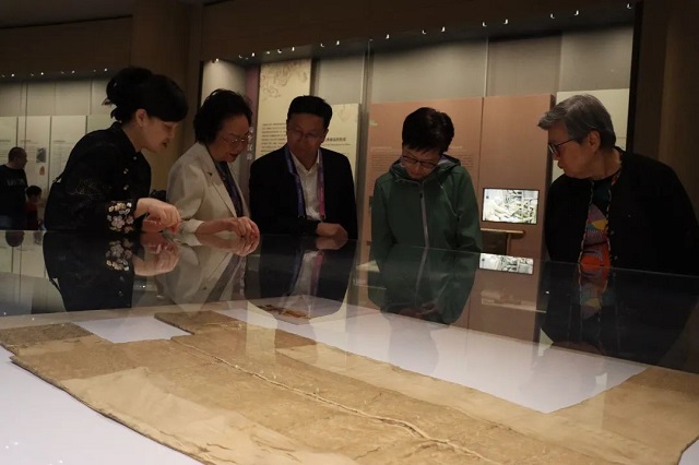 9月23日下午,浙江海外聯(lián)誼會榮譽(yù)會長、香港特別行政區(qū)第五任行政長官林鄭月娥,香港立法會首屆主席徐麗泰,澳門賀田工業(yè)股份有限公司董事長賀定一等一行參訪中國絲綢博物館,中國絲綢博物館館長季曉芬陪同參觀。